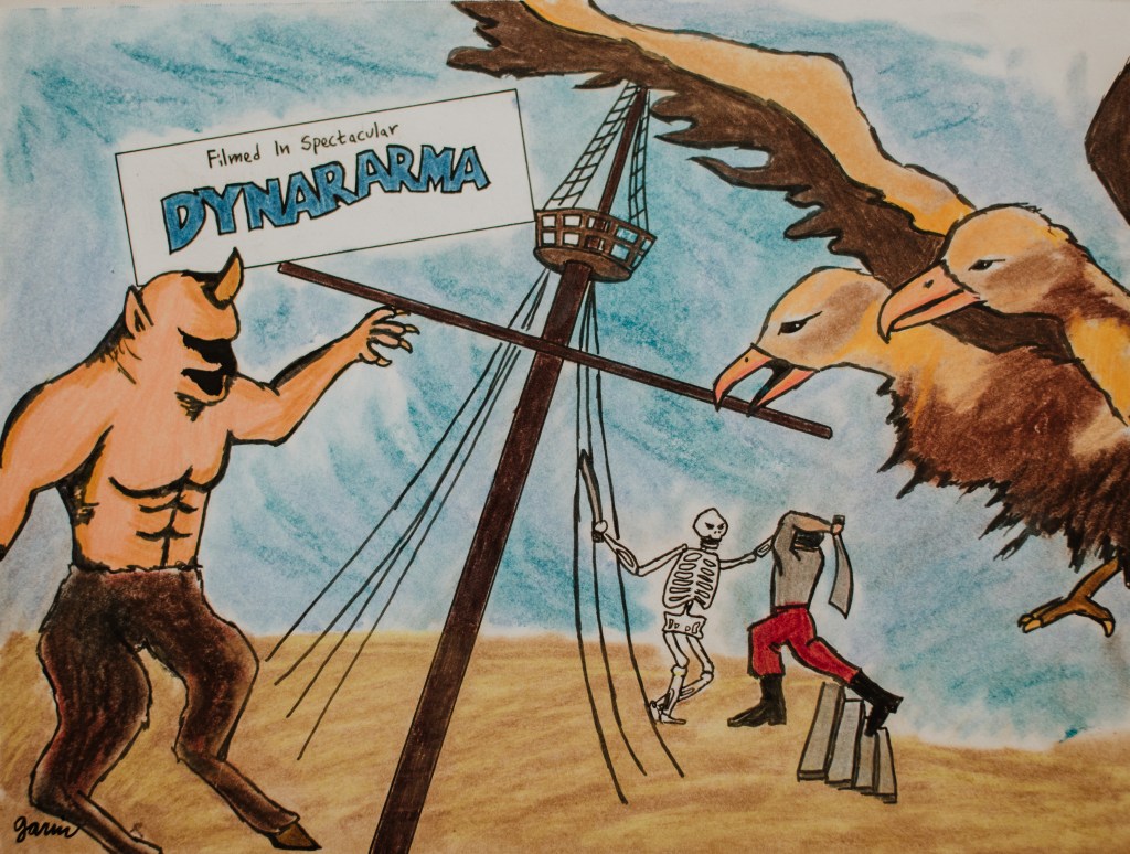Though Harryhausen’s stunning creatures would have been enticing enough, 7th Voyage was implemented with yet another gimmick to magnetize audiences to their local theater. The technique was called Dynamation, the so-called “new miracle of the screen”. Call it what you will, either way it still encapsulated Harryhausen’s trademark style. A decent promotional short subject, shown above, declared that using new technological advances and color they opened “vast new vistas in motion picture entertainment”. Dynamation was used all the way until 1981 with Clash of the Titans, then afterwards Ray retired from the profession. In a original review by Time magazine for Clash of the Titans, they quipped that “The real titan is Ray Harryhausen”.